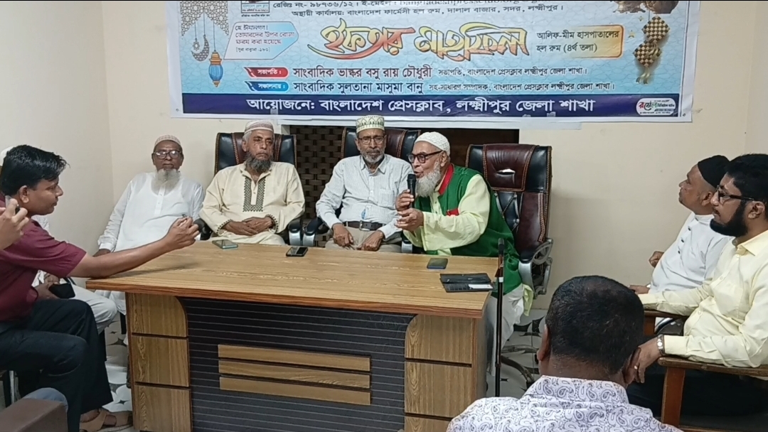 ভি বি রায় চৌধুরী – বাংলাদেশ প্রেসক্লাব লক্ষ্মীপুর জেলা শাখার আয়োজনে ১৫ মার্চ ২০২৬ ইং লক্ষ্মীপুরের উপশহর দালাল বাজার আলিফ-মীম হাসপাতালের অডিটোরিয়ামে এক ইফতার মাহফিলের আয়োজন করা হয়।